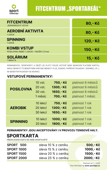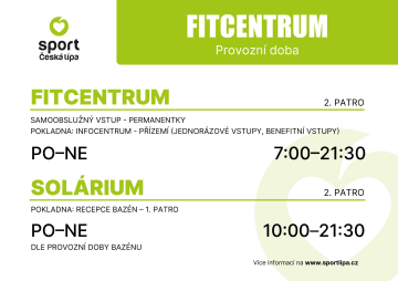 Fitcentrum naleznete ve druhém patře budovy Sportareálu. Plně vybavené Fitcentrum využívá široká veřejnost, ale také sportovní kluby k silové přípravě. V prostorách Fitcentra se nachází také solárium.