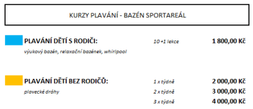 Plavecká škola SPORT nabízí kurzy plaváni pro děti od šesti měsíců do patnácti let věku: kurzy plavání kojenců s rodiči, kurzy plavání batolat s rodiči, kurzy plavání předškoláků a školáků bez rodičů.
